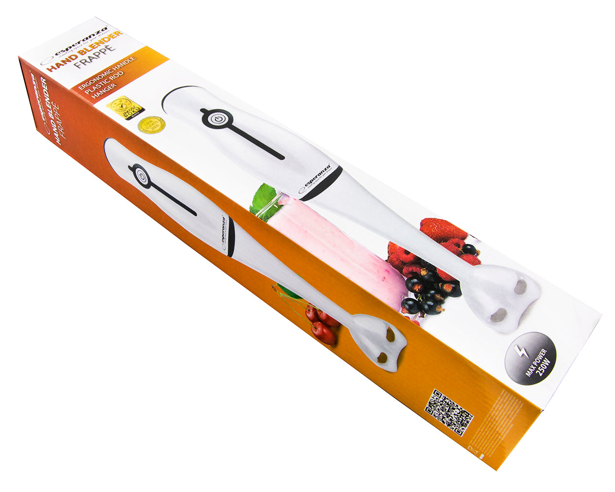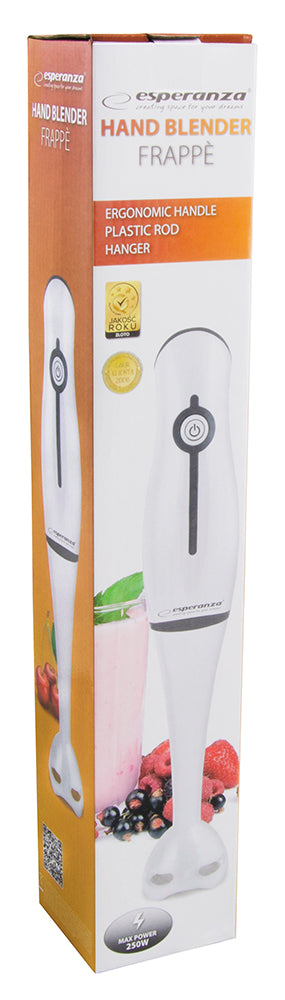 Oto nowoczesne urządzenie, które zaoszczędzi Twój czas - każdy produkt szybko i łatwo zmiksujesz w kilka chwil. Blender Esperanza FRAPPE wyposażylismy w odporny i trwały nóż ze stali nierdzewnej. Na pewno docenisz wygodny, ergonomiczny uchwyt oraz funcjonalność zwięczającego go wieszaka. Nasz blender jest dostępny w kilku miłych dla oka kolorach, z których co najmniej jeden przypadnie Ci do gustu i będzie pasować do Twojej kuchni.