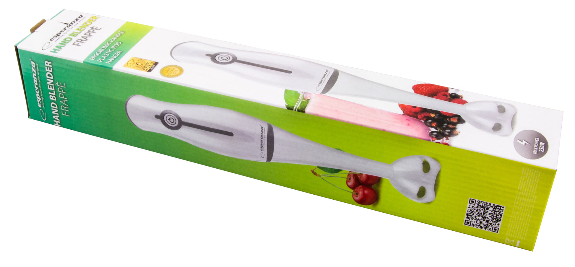 Oto nowoczesne urządzenie, które zaoszczędzi Twój czas - każdy produkt szybko i łatwo zmiksujesz w kilka chwil. Blender Esperanza FRAPPE wyposażylismy w odporny i trwały nóż ze stali nierdzewnej. Na pewno docenisz wygodny, ergonomiczny uchwyt oraz funcjonalność zwięczającego go wieszaka. Nasz blender jest dostępny w kilku miłych dla oka kolorach, z których co najmniej jeden przypadnie Ci do gustu i będzie pasować do Twojej kuchni.