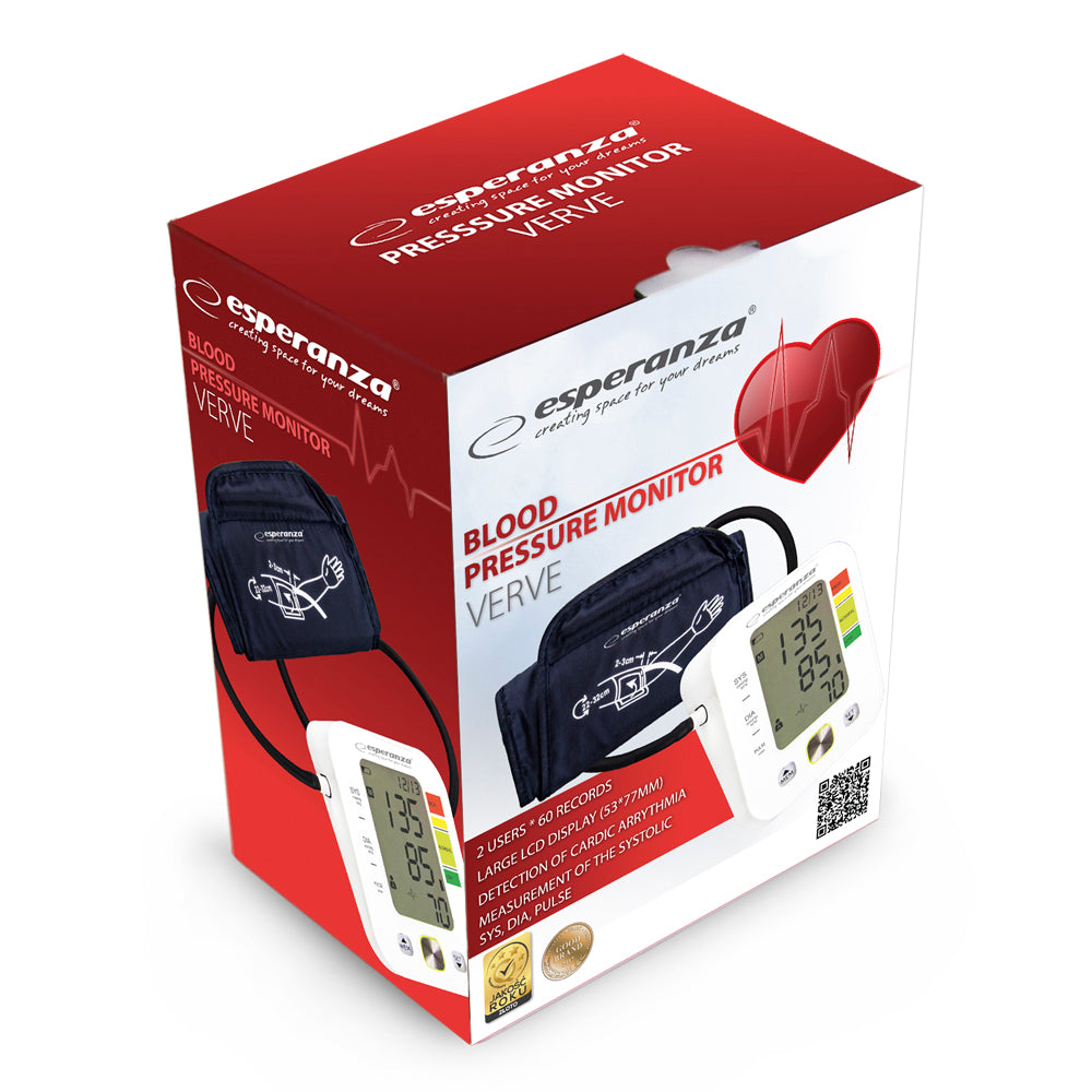 Ciśnieniomierz naramienny Esperanza VERVE to precyzyjne i funkcjonalne urządzenie, które umożliwia łatwe monitorowanie ciśnienia krwi i pulsu w domowym zaciszu. Dzięki nowoczesnej technologii pomiaru oscylometrycznego, dużemu wyświetlaczowi LCD oraz funkcji wykrywania arytmii serca, urządzenie gwarantuje dokładne wyniki, które pomagają w codziennym dbaniu o zdrowie. Idealny dla osób ceniących wygodę, dokładność oraz możliwość zapisu wyników dla dwóch użytkowników.