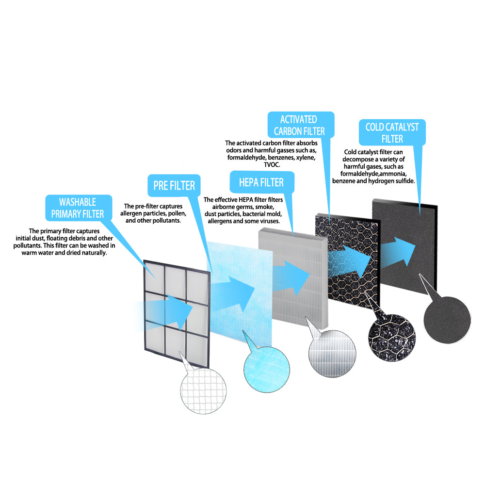 - Filtr 5-stopniowy: filtr podstawowy, filtr wstępny, filtr z aktywnym węglem, filtr HEPA H13 i zimny filtr katalityczny