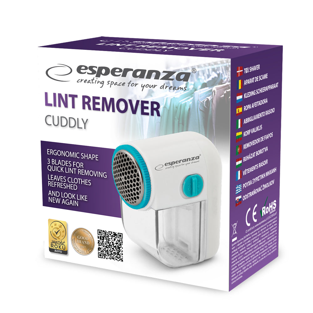 Praktyczna golarka Esperanza CUDDLY, do usuwania zmechaceń z ubrań, tapicerki, koców i innych tekstyliów, dzięki czemu dłużej będą wyglądały jak nowe. Ergonomiczny kształt idealnie dopasowuje się do dłoni. Przeźroczysty pojemnik na odpady pokazuje kiedy go opróżnić. Golarka usuwa zmechacenia szybko i skutecznie.