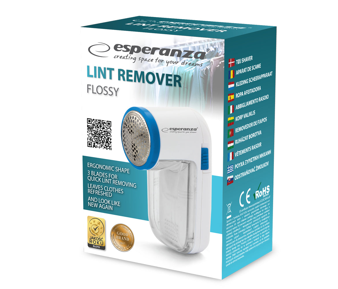 Praktyczna golarka Esperanza FLOSSY do usuwania zmechaceń z ubrań, tapicerki, koców i innych tekstyliów, dzięki czemu dłużej będą wyglądały jak nowe. Ergonomiczny kształt idealnie dopasowuje się do dłoni. Przeźroczysty pojemnik na odpady pokazuje kiedy go opróżnić. Golarka usuwa zmechacenia szybko i skutecznie.