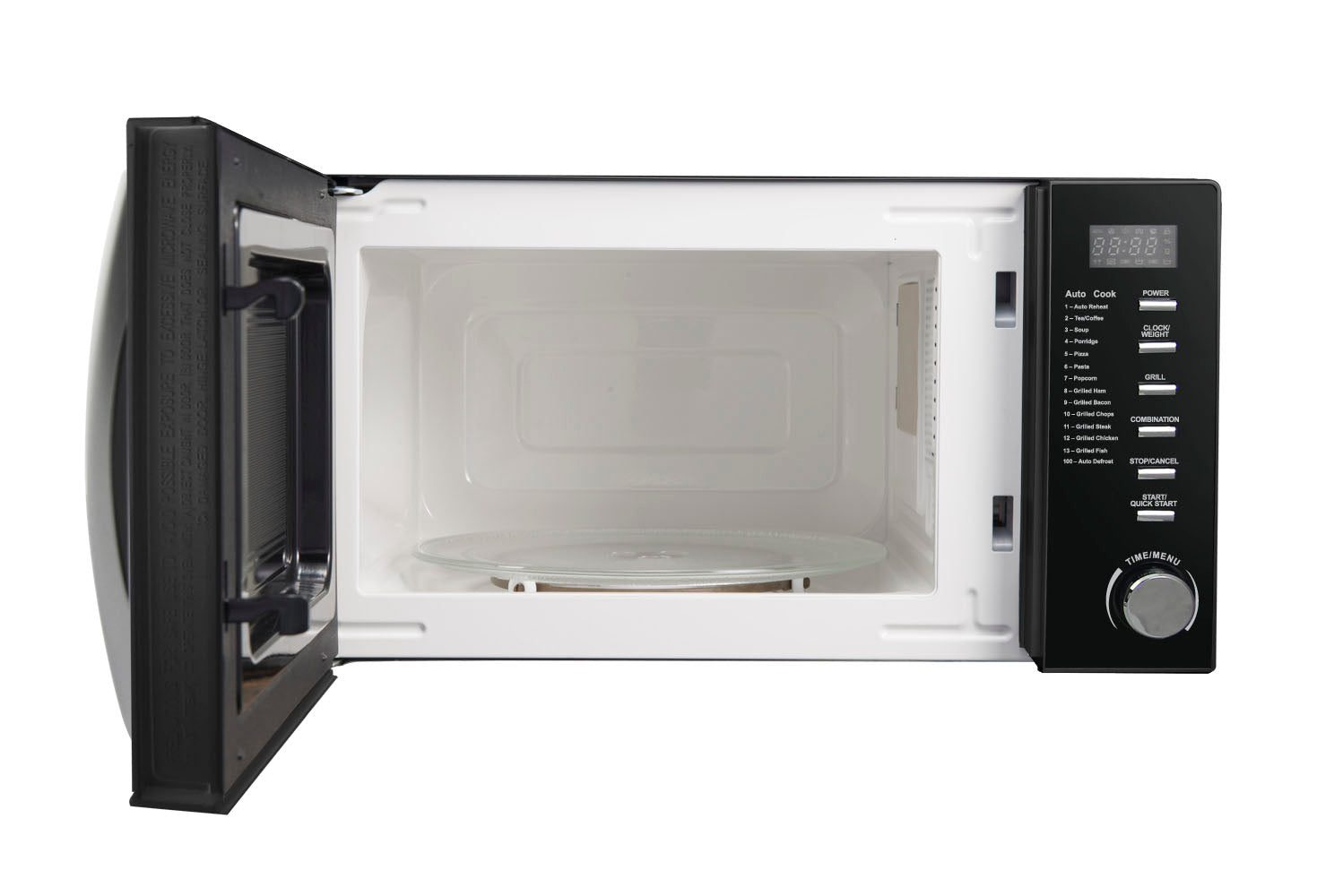 - Wyświetlacz LED: czas gotowania, poziom mocy, wskaźniki, godzina, aktualny status gotowania