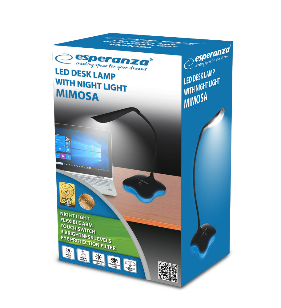 Nowoczesny model lampki biurkowej LED Esperanza MIMOSA z podświetlaną podstawą. Diody LED lampy świecą jasnym białym światłem, zbliżonym do dziennego, które nie męczy oczu. Ruchome ramię pozwala na ustawienie światła pod dowolnym kątem, co przekłada się na wygodę i elastyczność użytkowania. Specjalny filtr zmiękczający światło zapewnia ochronę dla oczu i zmniejsza uczucie ich zmęczenia. Lampka nie emituje szkodliwego promieniowania UV, a co za tym idzie jest bezpieczna dla skóry i oczu. Jednocześnie jest niezwykle energooszczędna, zasilana przez baterie AAA lub z zewnętrznego zasilacza USB.