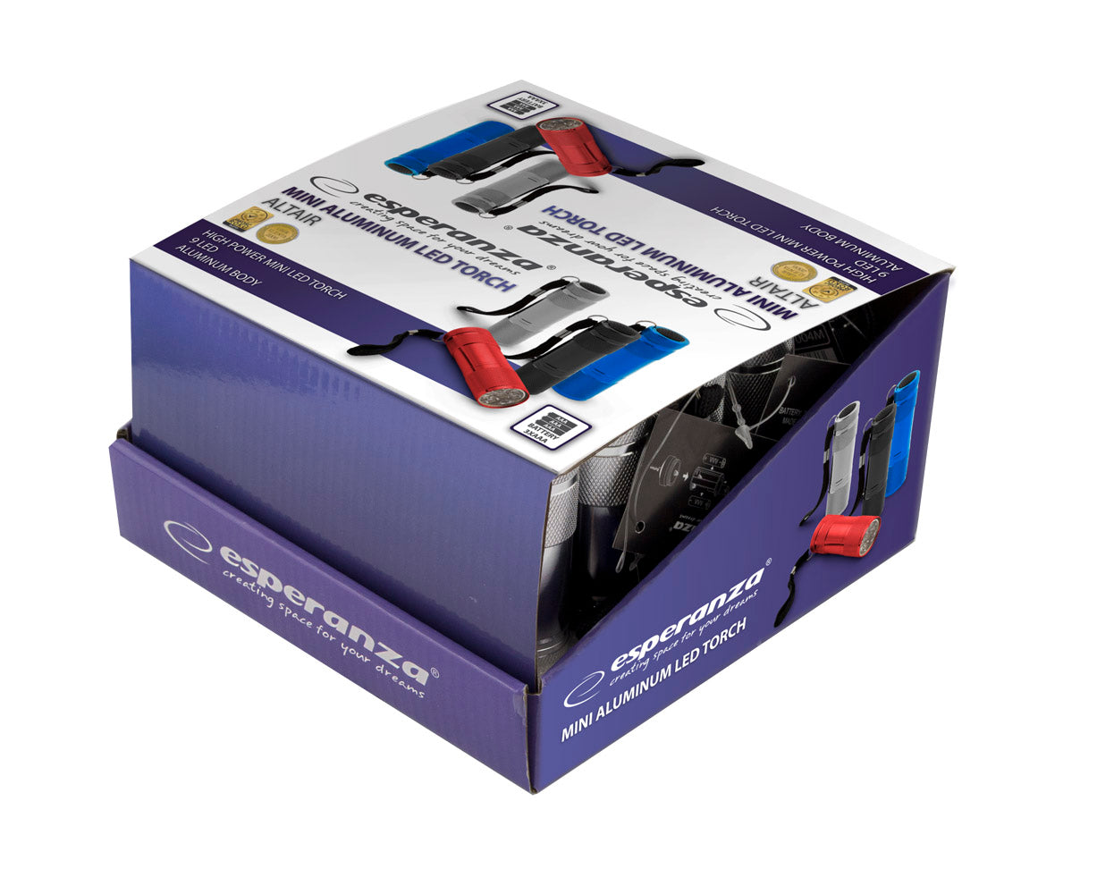 Produkt zapakowany zbiorczo w opakowania typu ‘DISPLAY'. 1 opakowanie ‘DISPLAY’ zawiera 20 latarek - po 5 szt. z 4 kolorów (czarny, czerwony, niebieski, srebrny).
