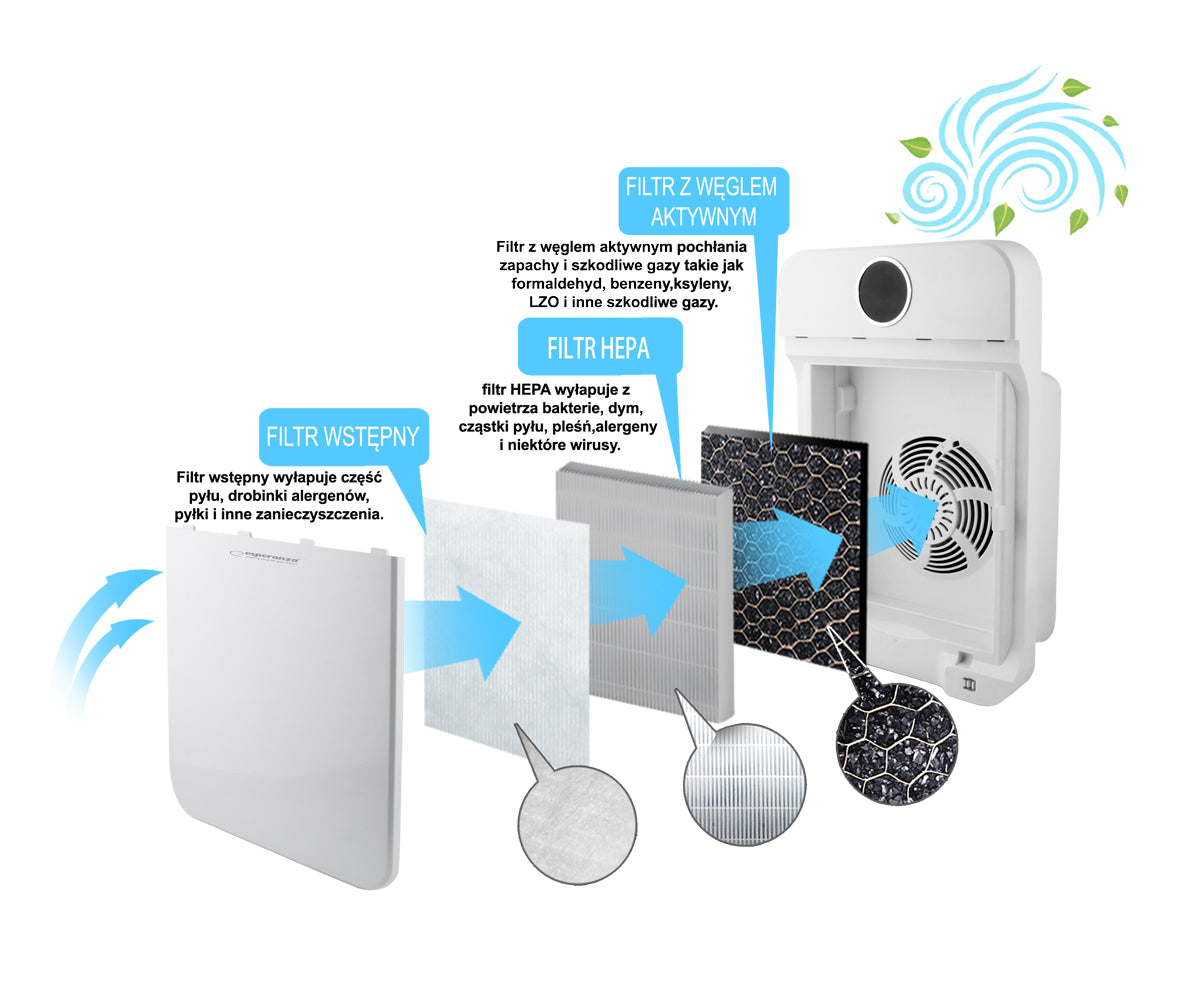 Dzięki zaawansowanemu, innowacyjnemu 3-poziomowemu filtrowi, oczyszczacz powietrza Esperanza ZEPHYR zatrzymuje aż do 99.97% zanieczyszczeń takich jak: alergeny, pyłki czy kurz. Wchłania formaldehyd, benzen, ksylen oraz inne szkodliwe gazy, a także nieprzyjemne zapachy. Jony ujemne mają niezwykłą zdolność łączenia się z dodatnio naładowanymi cząstkami pyłu i dymu. Dzięki temu zabijają bakterie i wirusy. Oczyszczacz powietrza Esperanza ZEPHYR to nowoczesne urządzenie, które zapewni idelanie czyste i świeże powietrze w Twoim domu.