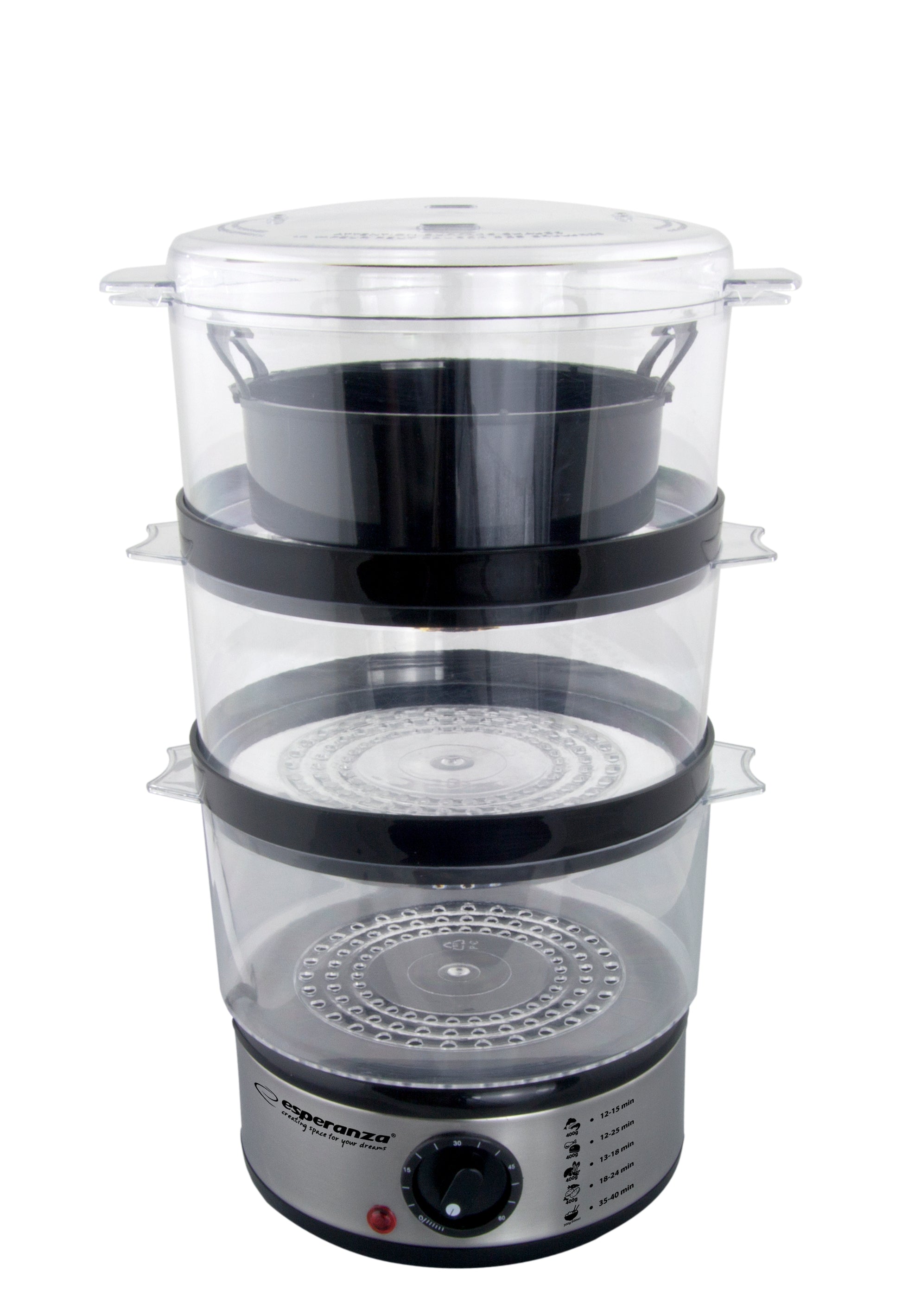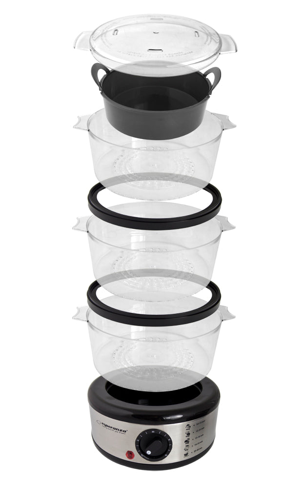 Parowar Esperanza STEAM VOLCANO to niezastąpione urządzenie w każdej kuchni. Pozwala szybko przygotować nawet kilka dań w tym samym czasie, zachowując przy tym ich naturalny zapach i smak. W porównaniu do dań gotowanych w wodzie posiłki przygotowane na parze zachowują witaminy i składniki odżywcze, co sprawia, że są bardziej wartościowe i zdrowsze. Trzy pojemniki o dużej pojemności umożliwiają jednoczesne gotowanie kilku różnych dań. Wbudowany minutnik odliczający czas gotowania ułatwia proces gotowania. Dzięki prostej budowie obsługa i czyszczenie parowaru są bardzo łatwe. Posiłki gotowane na parze są zalecane przez dietetyków. Mają szczególne znaczenie dla osób z problemami z układem pokarmowym oraz wszystkich, którzy dbają o swoją sylwetkę.