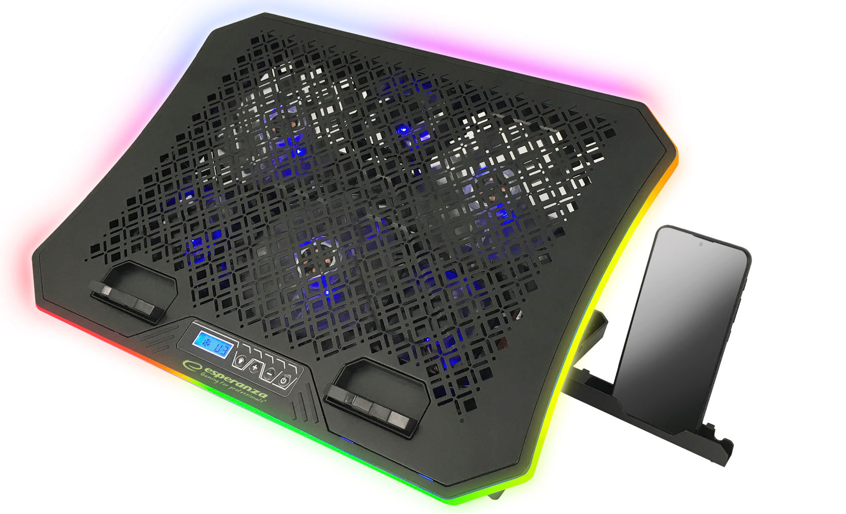 Podstawka chłodząca z podświetleniem LED RGB - Esperanza GALERINE. Jej niezwykle ciche wentylatory usuwają ciepło wytwarzane pod spodem notebooka, chłodząc go i obniżając temperaturę pracy jego podzespołów co zapewnia stabilną pracę. Solidnie wykonana, wytrzymała konstrukcja z łatwością utrzymuje ciężar notebooka. Nie wymaga zewnętrznych źródeł zasilania – zasilana z portu USB notebooka. Nie wymaga instalacji. Trwała, wygodna i łatwa w przenoszeniu. Kompatybilna ze wszystkimi rodzajami notebooków wielkości do 19”. Dodatkowo podstawka posiada funkcjonalny uchwyt na telefon.