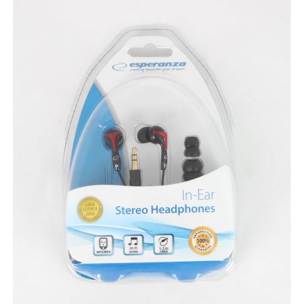 Słuchawki douszne Esperanza do odtwarzaczy audio, MP3/MP4, komputerów i innych urządzeń posiadających standardowe wyjście audio. Wyposażone zostały w trwałe, łatwo dopasowujące się do kształtu ucha i tłumiące zewnętrzne hałasy wkładki gumowe. Posiadają wzmocniony efekt odtwarzania basów. W komplecie dwie pary nakładek gumowych o różnych rozmiarach.