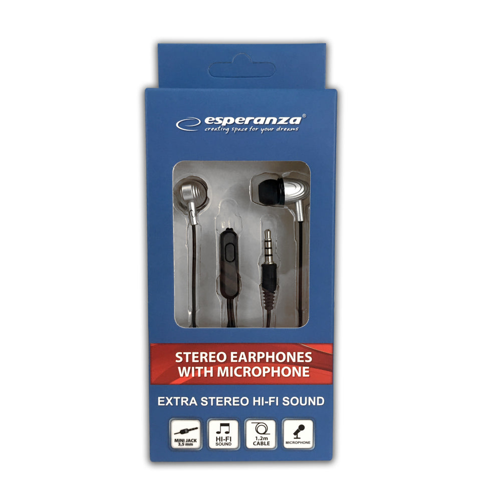 Słuchawki douszne marki Esperanza z mikrofonem i regulacją głośności do odtwarzaczy audio, MP3/MP4, komputerów i innych urządzeń posiadających standardowe wyjście audio. Wyposażone zostały w trwałe, łatwo dopasowujące się do kształtu ucha, tłumiące zewnętrzne hałasy wkładki gumowe. Posiadają wzmocniony efekt odtwarzania basów.