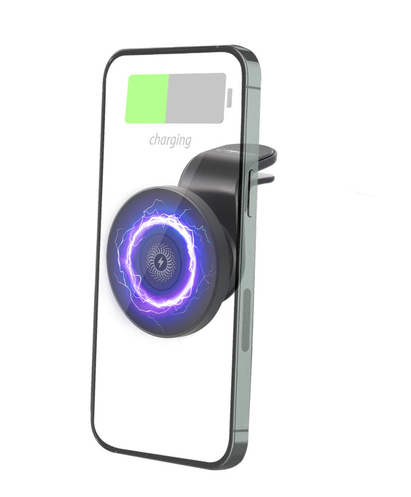 Uchwyt magnetyczny z ładowarką bezprzewodową do smartfonów Esperanza HOOP, przytwierdzany do kratki wentylacyjnej w samochodzie. Umożliwia szybkie i wygodne mocowanie telefonu bez zarysowań i uszkodzeń jego obudowy. Ładuj wygodnie telefon jednocześnie korzystając z nawigacji i innych funkcji telefonu w trakcie jazdy.
