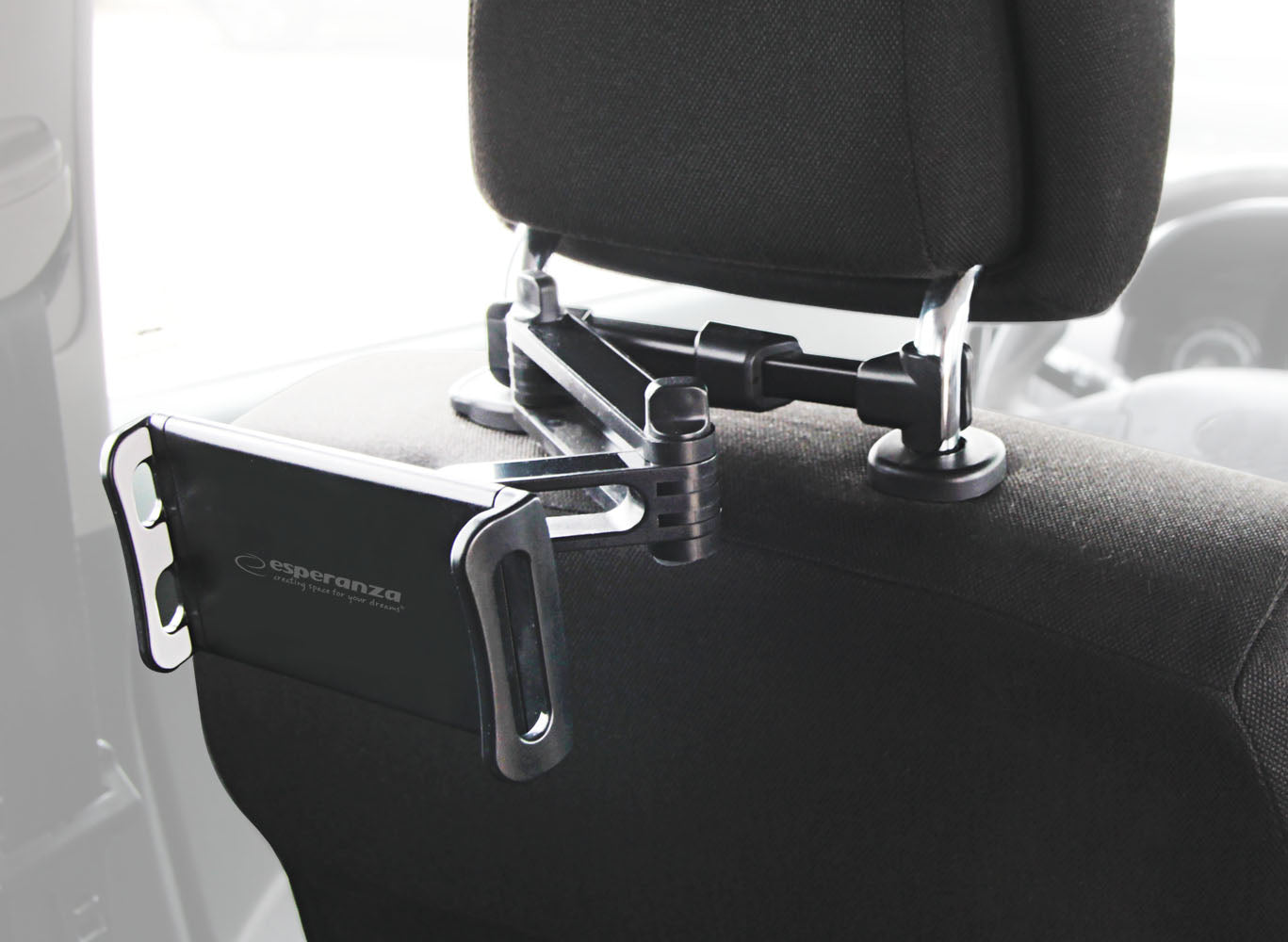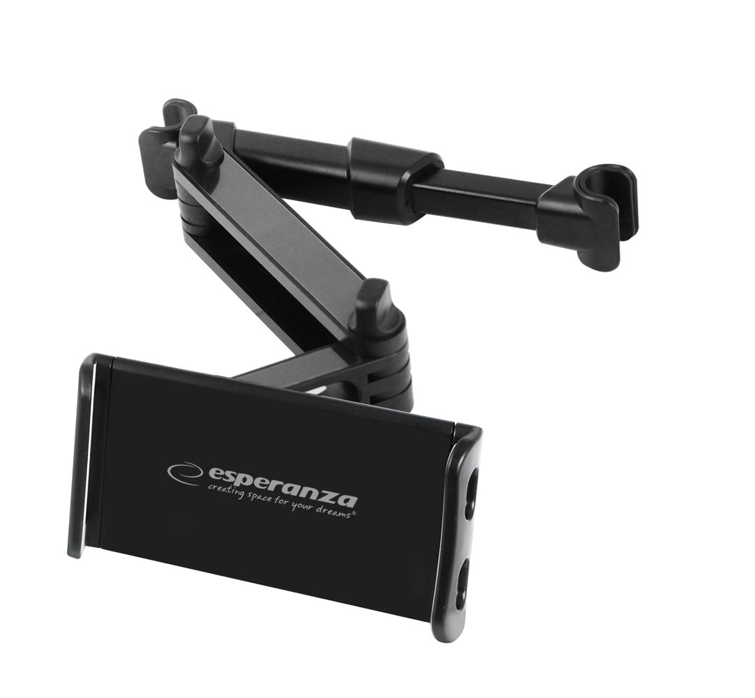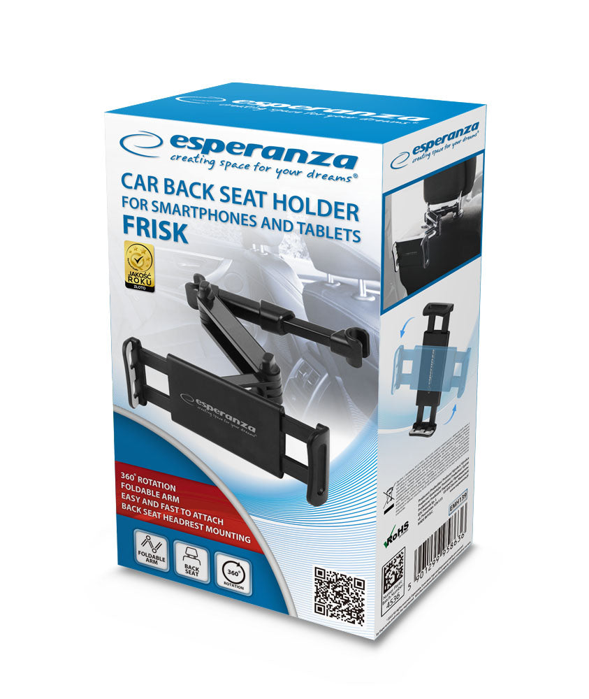 Uchwyt samochodowy Esperanza FRISK na telefon lub tablet do montażu z tyłu zagłówków przedniego siedzenia w samochodzie. W celu zamocowania uchwytu należy wcisnąć listwę mocującą, włożyć między pręty zagłówka i zwolnić nacisk. Uchwyt samoczynnie dopasuje się do wymiarów prętów zagłówka. Dodatkowo ramię pozwala przybliżyć urządzenie mobilne do siebie lub bliżej środka samochodu co przekłada się na komfort użytkowania.