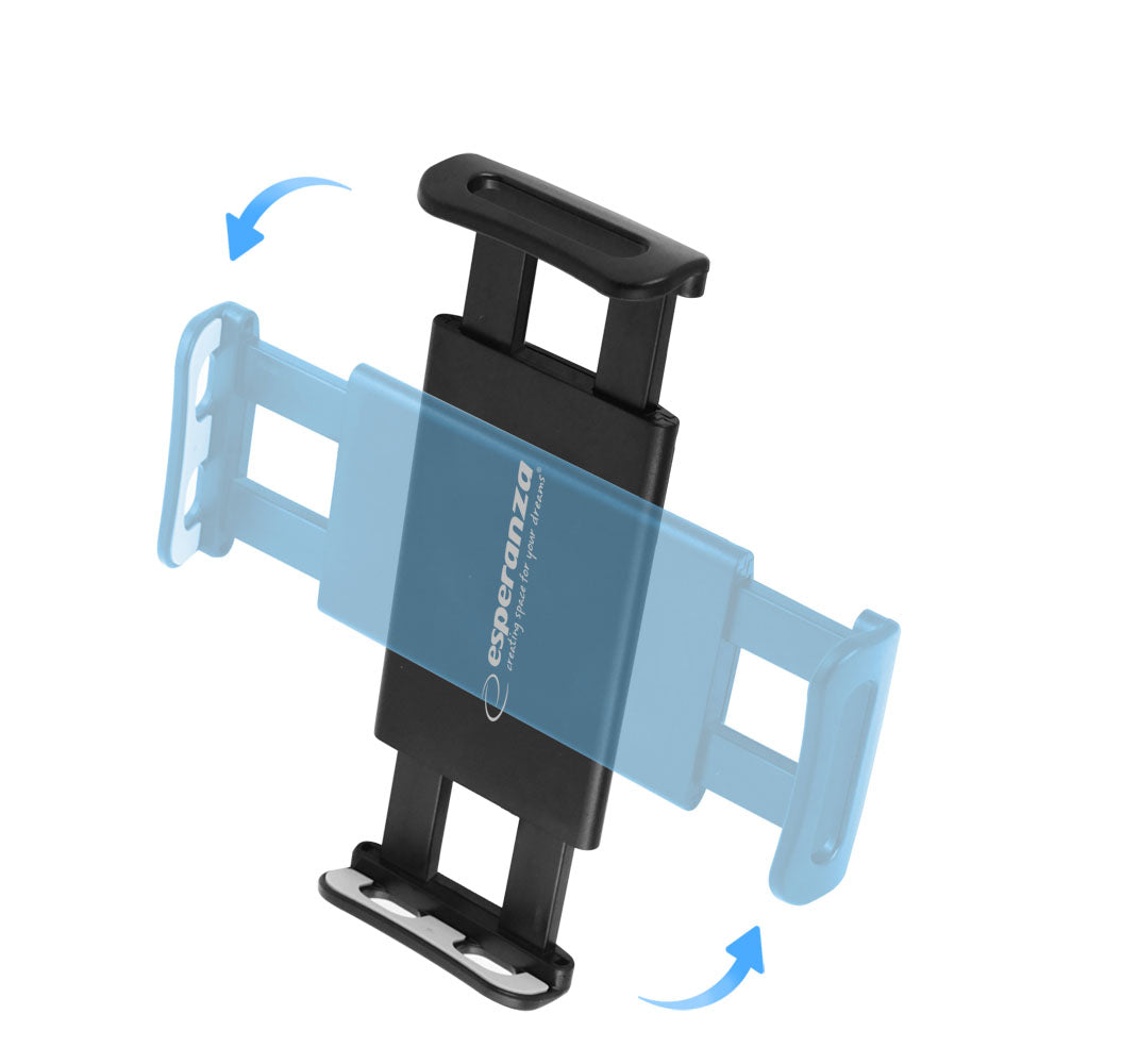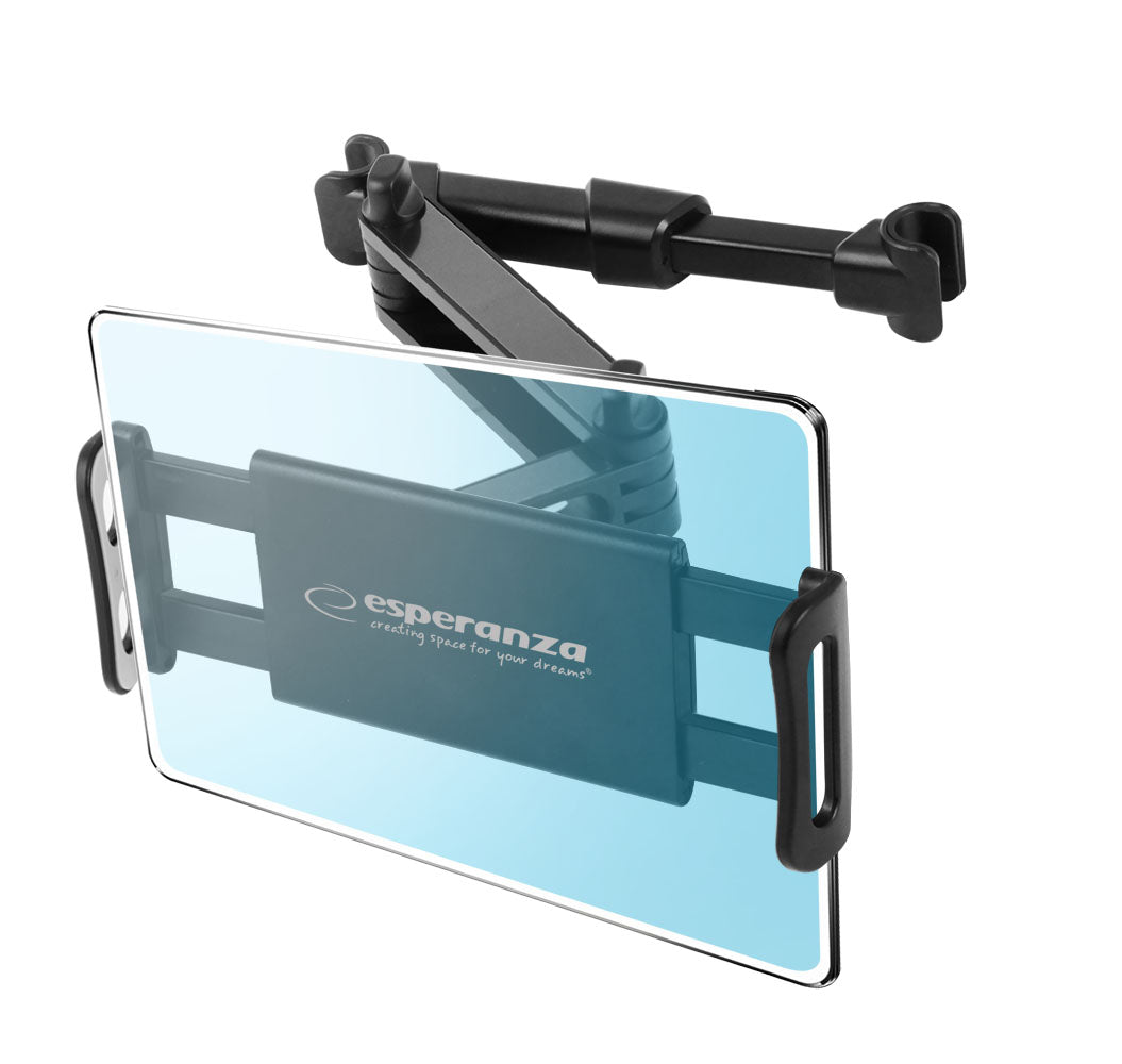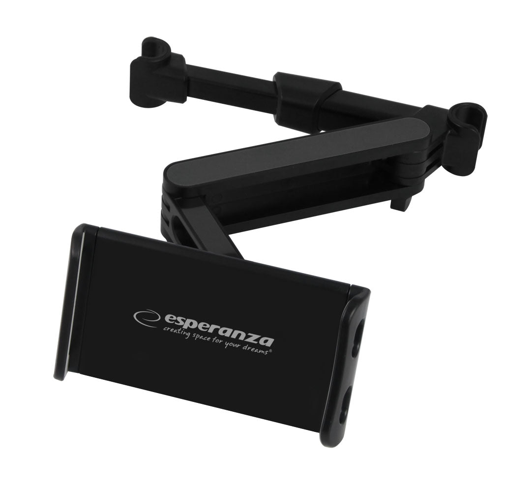 Uchwyt samochodowy Esperanza FRISK na telefon lub tablet do montażu z tyłu zagłówków przedniego siedzenia w samochodzie. W celu zamocowania uchwytu należy wcisnąć listwę mocującą, włożyć między pręty zagłówka i zwolnić nacisk. Uchwyt samoczynnie dopasuje się do wymiarów prętów zagłówka. Dodatkowo ramię pozwala przybliżyć urządzenie mobilne do siebie lub bliżej środka samochodu co przekłada się na komfort użytkowania.