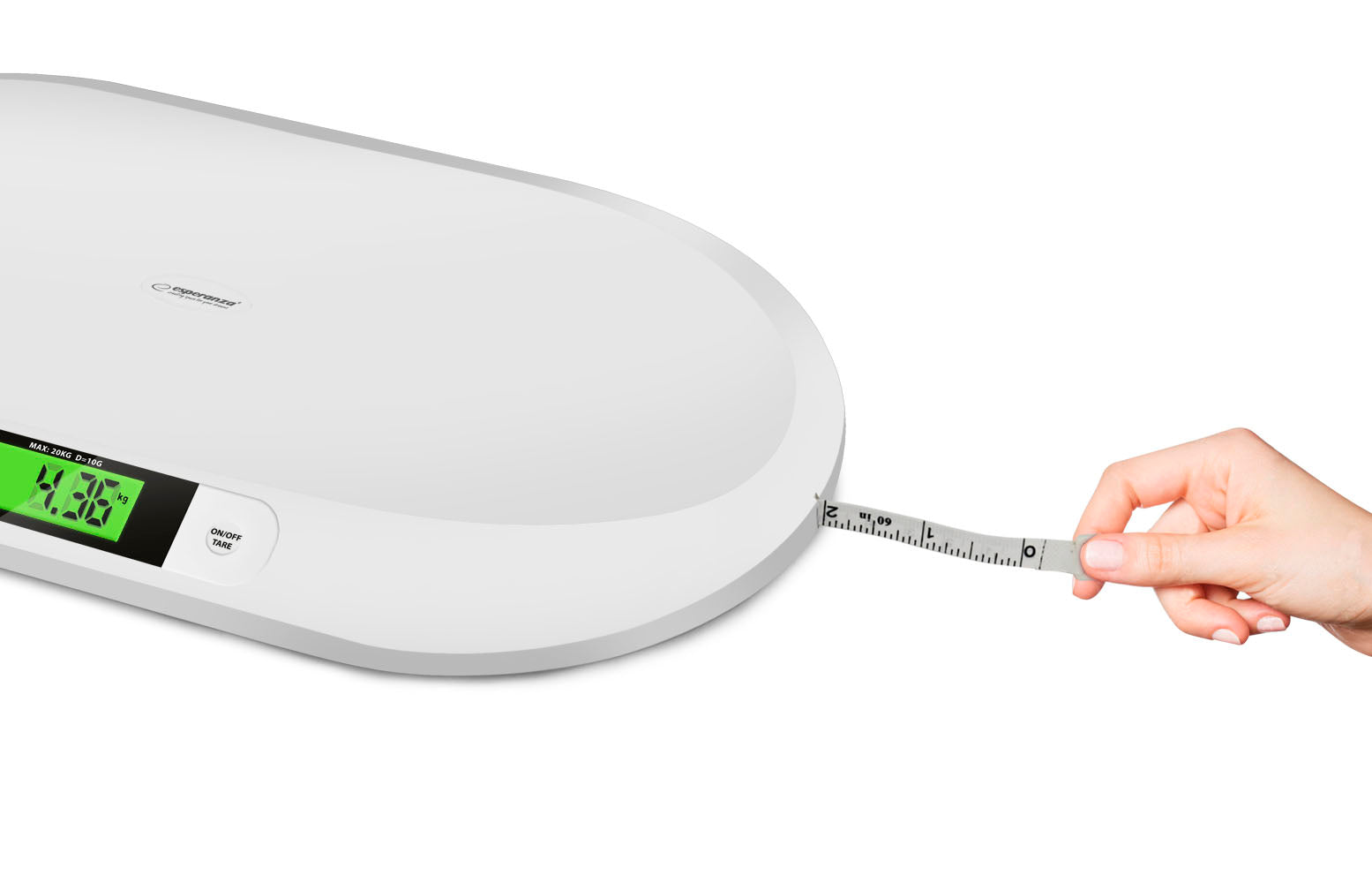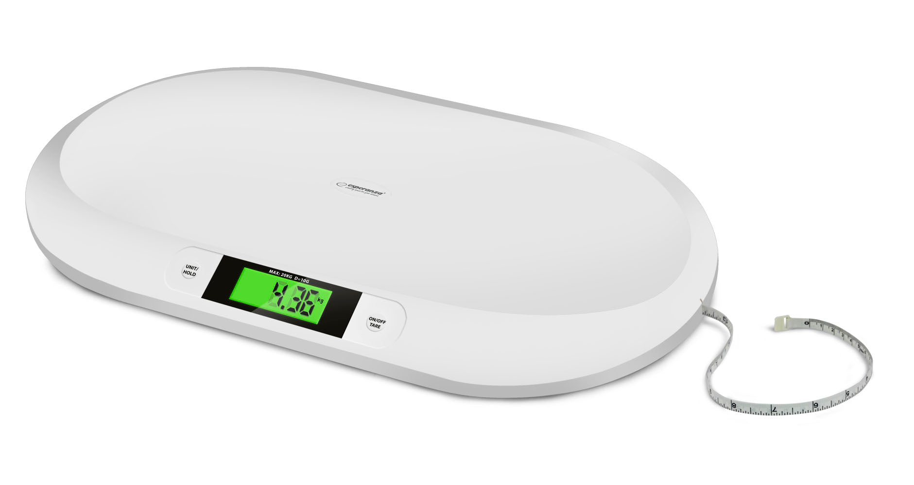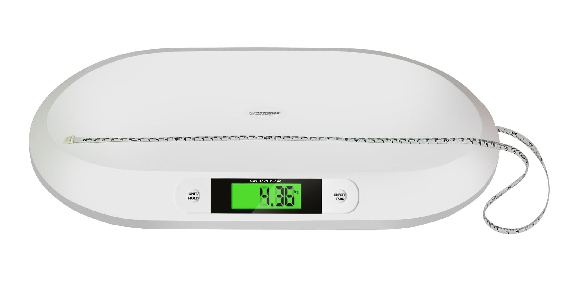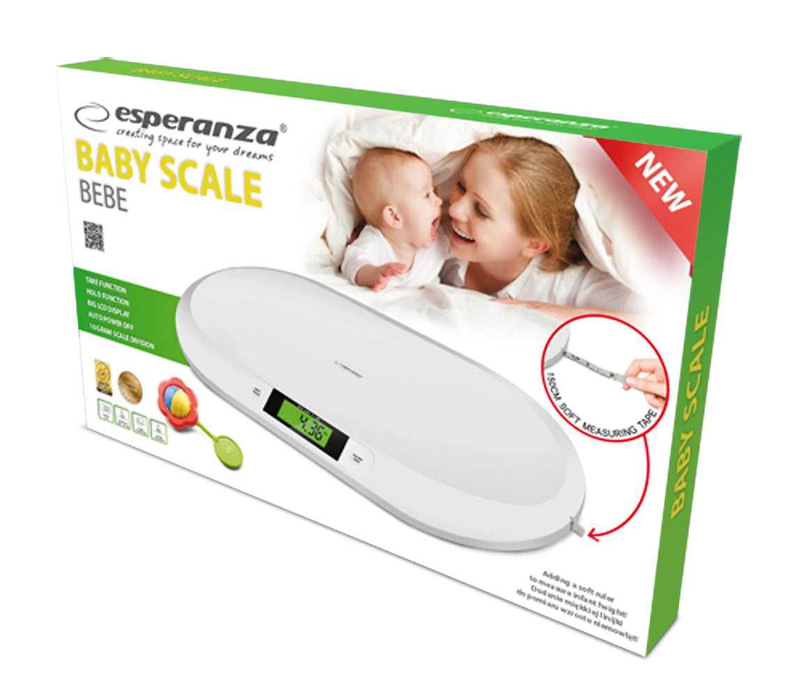 Nowoczesna, elektroniczna waga dla niemowląt Esperanza BEBE, dzięki której możesz kontrolować wagę dziecka. Waga zawiera też miarkę, by kontrolować długość dziecka. Regularne sprawdzanie wagi dziecka pomaga nadzorować jego prawidłowy rozwój. Czytelny wyświetlacz wyświetlacz ciekłokrystaliczny ułatwia odczytywanie wskazań. Urządzenie posiada funkcję tarowania oraz funkcję HOLD ułatwiającą zważenie ruchliwego niemowlęcia. Ergonomiczny kształt wagi zapewnia dziecku wygodę i bezpieczeństwo podczas ważenia. Waga dla niemowląt Esperanza, to najlepszy sposób, aby monitorować rozwój i zdrowie dziecka.