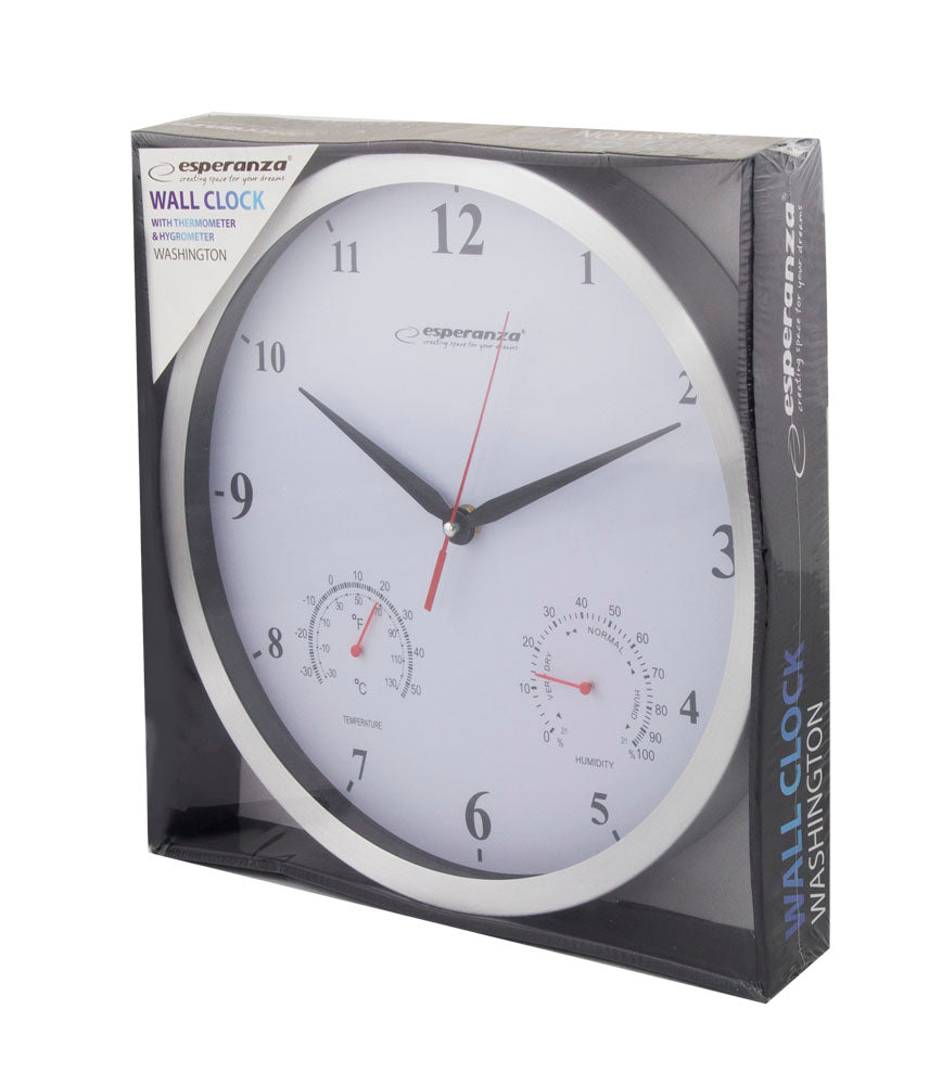 Nasz zegar ścienny Esperanza WASHINGTON służy nie tylko do pokazywania czasu - można z niego odczytać też temperaturę oraz wilgotność otoczenia. Jego wzornictwo sprawia, iż udekorujesz nim mieszkanie, biuro, sklep czy restaurację. Duża tarcza gwarantuje wysoką czytelność wskazań nawet z odległego miejsca pomieszczenia, w którym wisi nasz zegar.