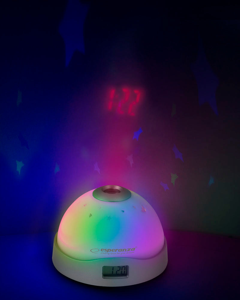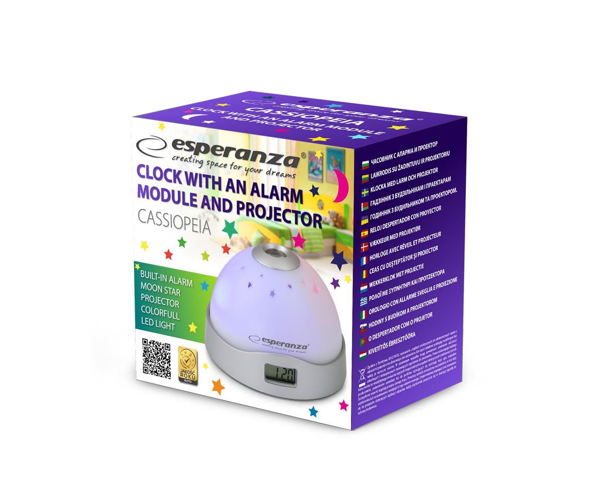 Zegar Esperanza CASSIOPEIA prócz klasycznego wskazywania godziny, wyświetla kolorową projekcję rozgwieżdżonego nieba, tworząc niepowtarzalny nastrój w sypialni. Dodatkowo umożliwia wyświetlanie aktualnego czasu na suficie. Posiada wbudowany budzik z funkcją drzemki. Idealny dla dzieci, które nie lubią całkowitej ciemności.