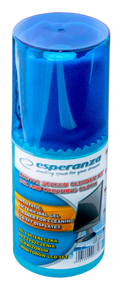 Zestaw czyszczący marki Esperanza do monitorów i telewizorów LCD. Zestaw zawiera żel czyszczący i ściereczkę z mikrofibry. Skutecznie usuwa brud i kurz w telewizorach, laptopach, zestawach do nawigacji satelitarnej, monitorach, telewizorach LCD itp. Żel nie zawiera alkoholu. Sposób użycia: niewielką ilość żelu nanieść na ściereczkę bezpyłową i czyścić monitor. Przed czyszczeniem sprzętu odłącz zasilanie.