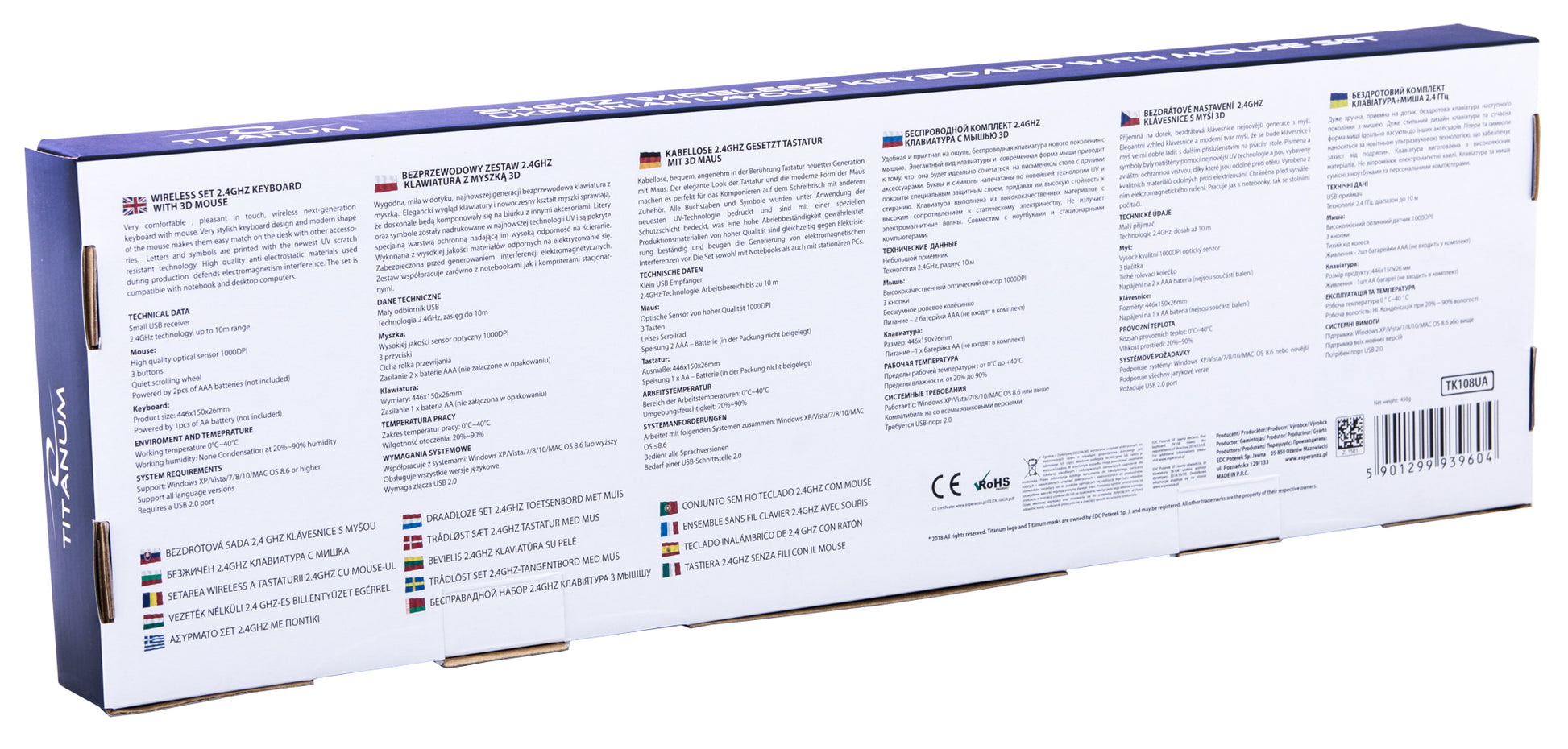 Funkcjonalny, wygodny, najnowszej generacji bezprzewodowy zestaw Titanum MEMPHIS, składający się z klawiatury w wersji ukraińskiej oraz myszki. Elegancki, a zarazem nowoczesny wygląd zestawu sprawiają, że doskonale będzie się komponować się na biurku z innymi akcesoriami. Litery oraz symbole zostały nadrukowane na klawiaturze w najnowszej technologii UV i są pokryte specjalną warstwą ochronną nadającą im wysoką odporność na ścieranie. Produkt wykonano z wysokiej jakości materiałów odpornych na elektryzowanie się - został zabezpieczony przed generowaniem interferencji elektromagnetycznych. Zestaw współpracuje zarówno z notebookami jak i komputerami stacjonarnymi.