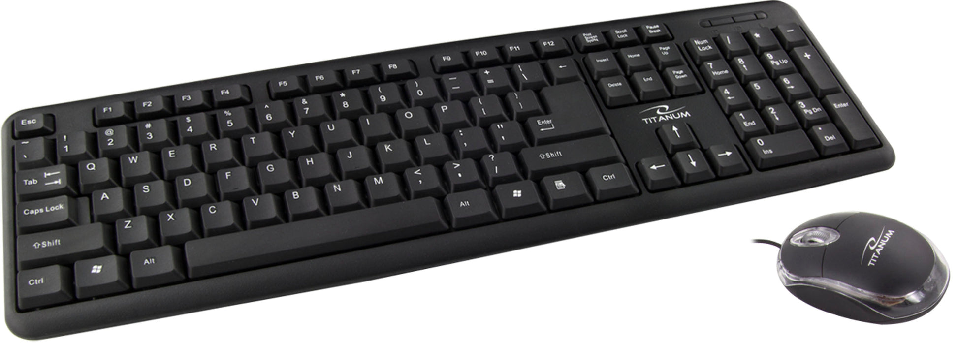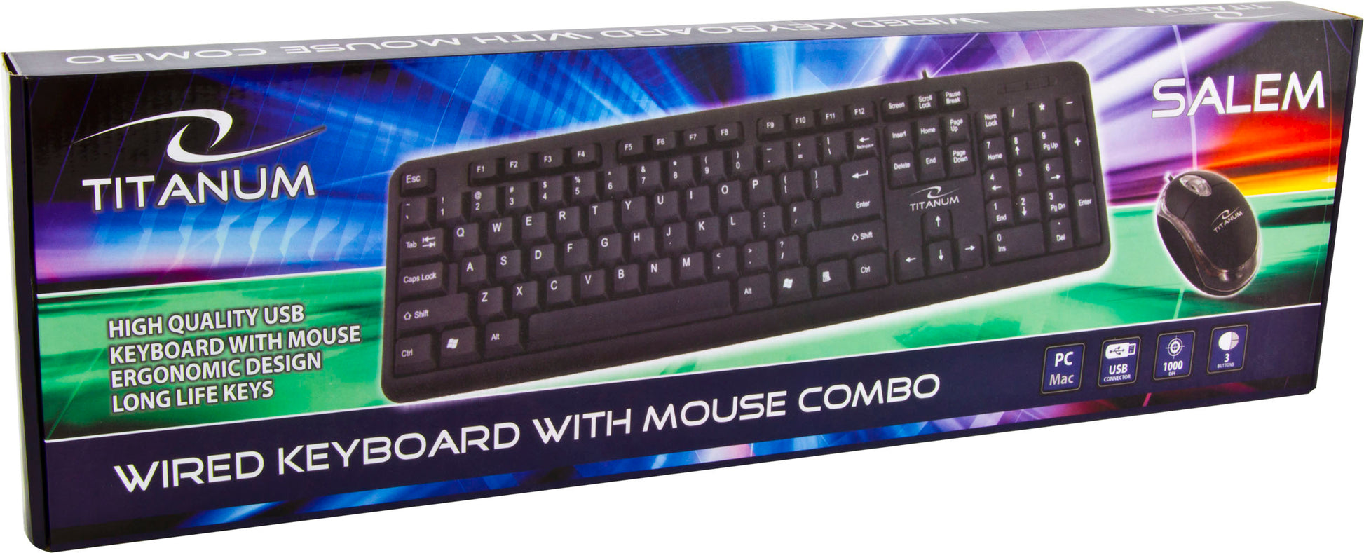 Zestaw przewodowy Titanum SALEM: klawiatura z myszką optyczną USB. Ergonomiczny kształt i bardzo dobra elastyczność klawiszy klawiatury. Litery oraz symbole na klawiaturze nadrukowane są w najnowszej technologii UV i pokryte specjalną warstwą ochronną - wysoka odporność na ścieranie.