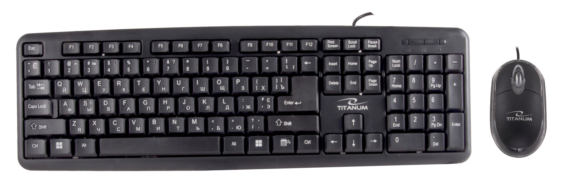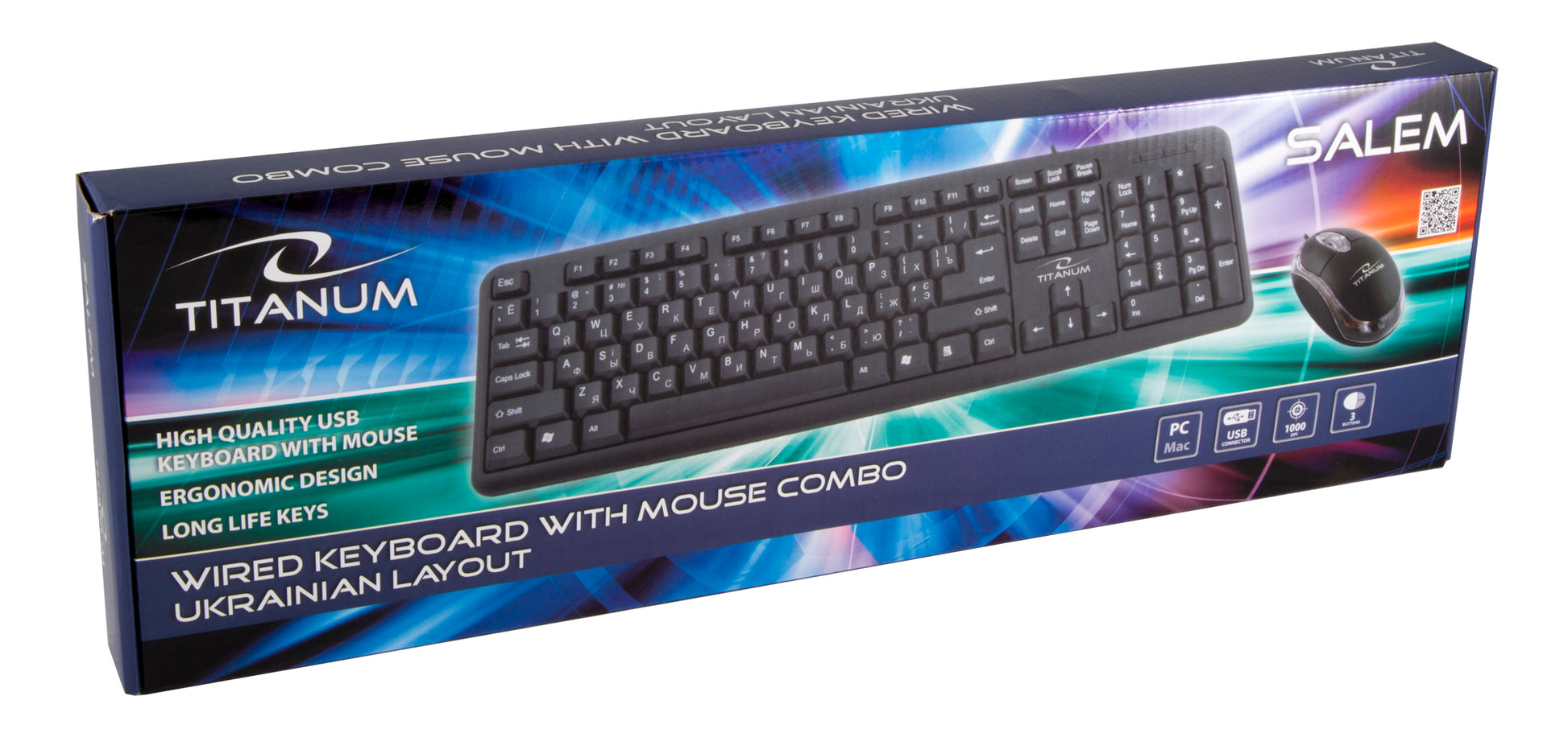 Zestaw przewodowy Titanum SALEM: klawiatura z myszką optyczną USB - wersja ukraińska. Ergonomiczny kształt i bardzo dobra elastyczność klawiszy klawiatury. Litery oraz symbole na klawiaturze nadrukowane są w najnowszej technologii UV i pokryte specjalną warstwą ochronną - wysoka odporność na ścieranie.
